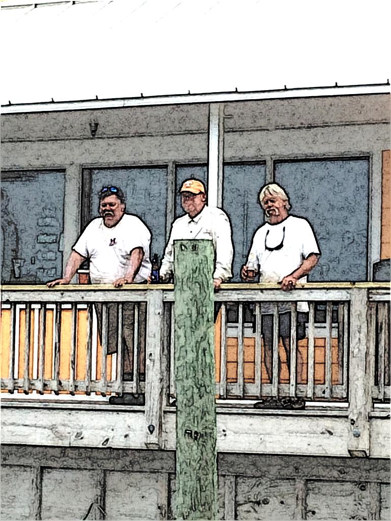 3 Captains- Bob Bauer, Bruce “LB” Armstrong, Rich Siddal in repose at Hatteras Landing